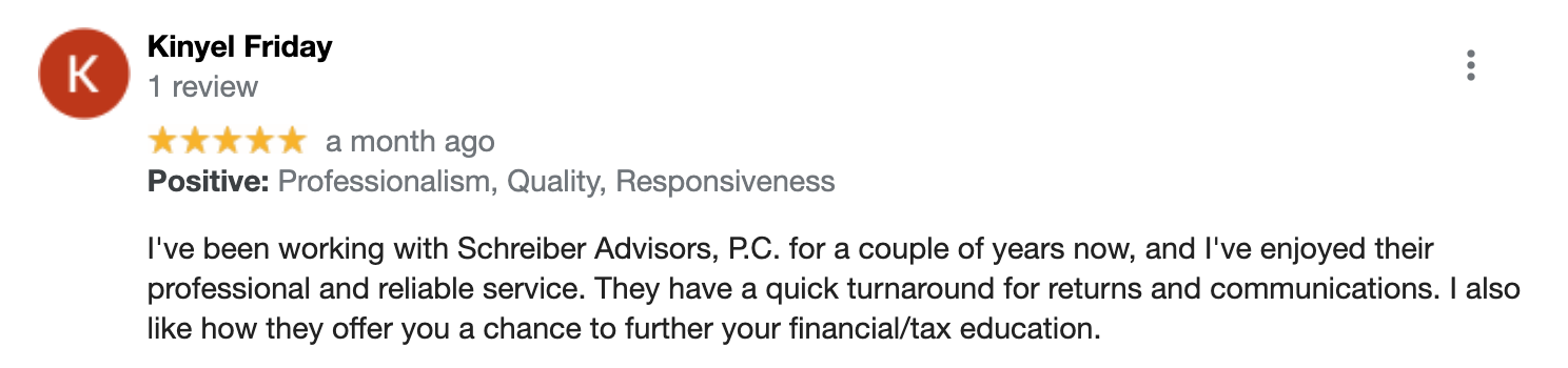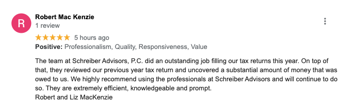 "The team at Schreiber Advisors, P.C. did an outstanding job filling our tax returns this year. On top of that, they reviewed our previous year tax return and uncovered a substantial amount of money that was owed to us. We highly recommend using the professionals at Schreiber Advisors and will continue to do so. They are extremely efficient, knowledgeable and prompt".