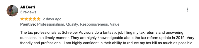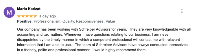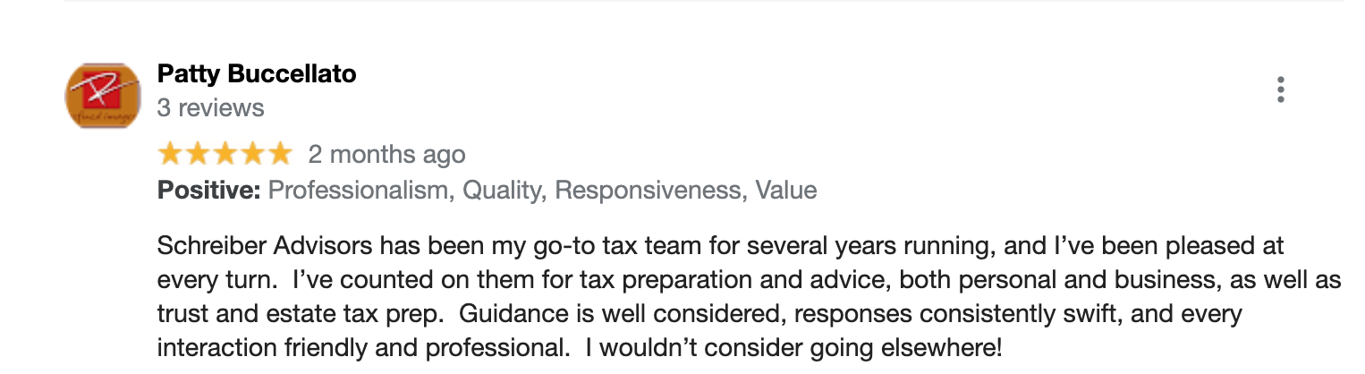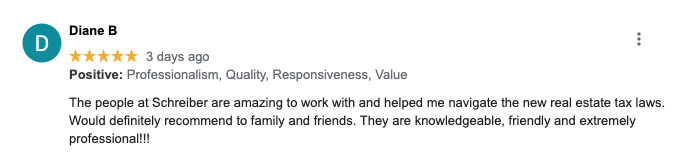 "The people at Schreiber are amazing to work with and helped me navigate the new real estate tax laws. Would definitely recommend to family and friends. They are knowledgeable, friendly and extremely professional!!!"